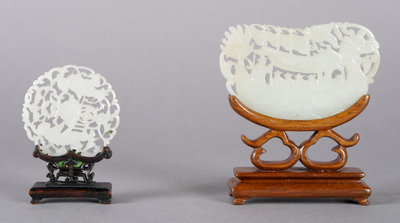 comprising one of white jade with pierced carving of two figures and a censer, and one pale celadon carving of a dragon boat.