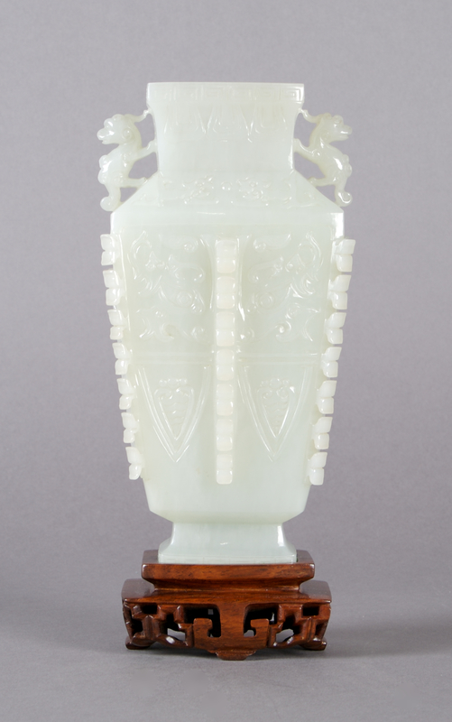 of celadon stone having raised archaic bronze decoration throughout with six vertical bands of carved relief decoration, with animal form handles.