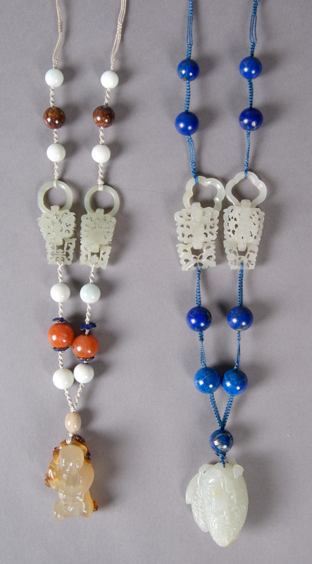 each having a carved pendant, one of agate depicting a boy, the other of celadon jade depicting an exotic fruit, and each having a pair of carved jade buckles.