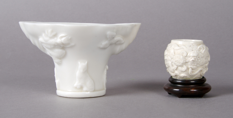 comprised of one horn shaped cup and one carved porcelain miniature vase.