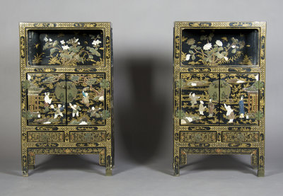 each with rectangular top over two doors above two drawers, decorated with figures in a landscape.
