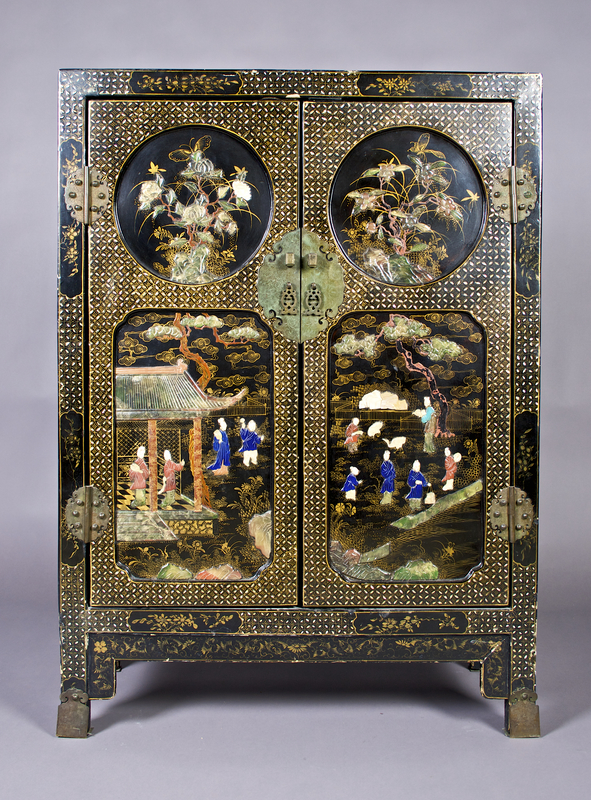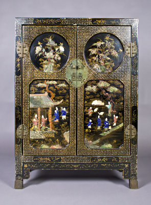 A Chinese Lacquered, Mother-of-Pearl and Hardstone Inset Cabinet,