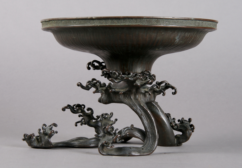 the bowl having a key-fret border around the rim with the exterior having a naturalistic rib-like pattern, having wave form base, with impressed four character mark on bowl and three character mark on base.
