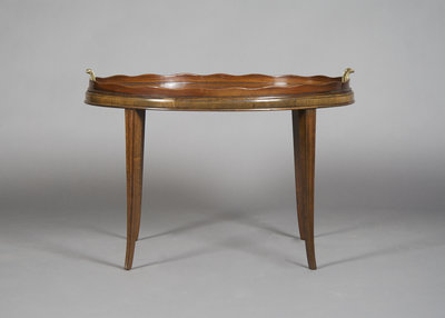 the tray having a scalloped edge with brass handles, raised upon a later stand.