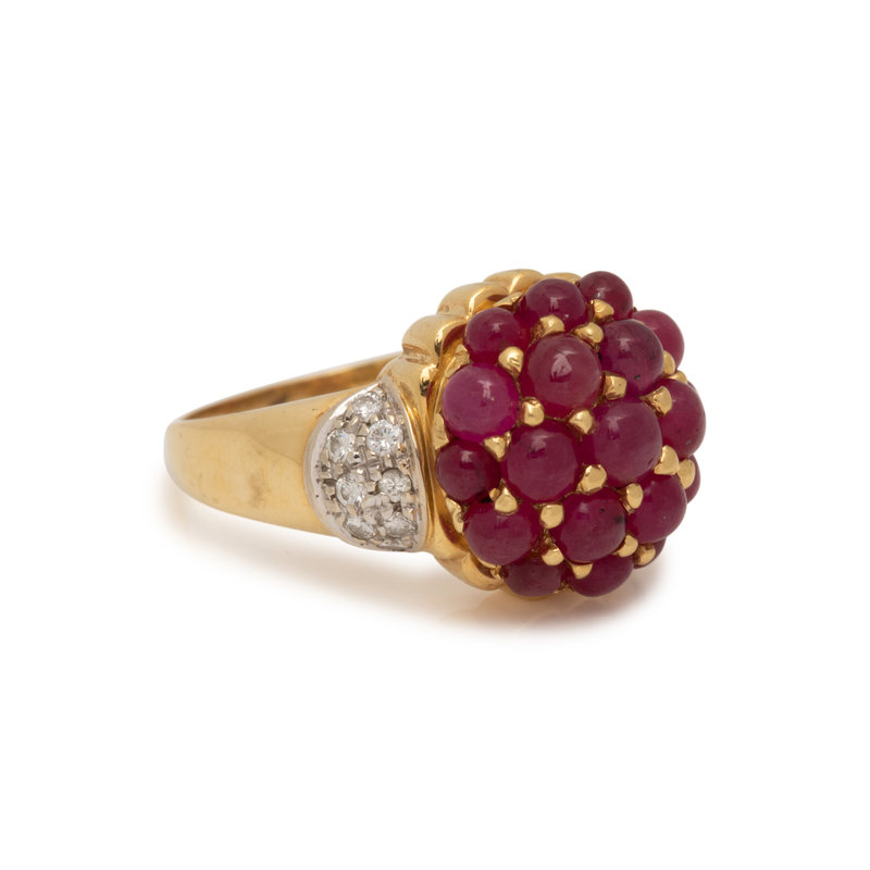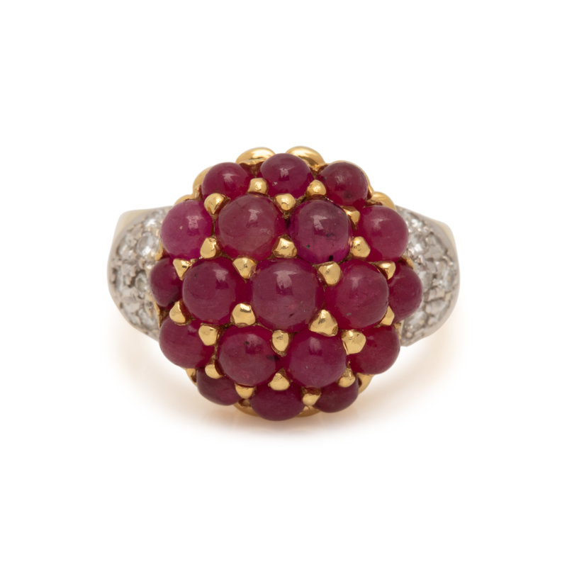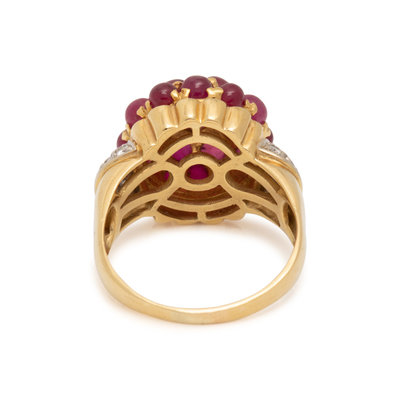 Containing 19 round cabochon rubies and 16 round brilliant cut diamonds weighing approximately 0.25 carat total. Mounted in bicolor gold. Ring size 7 1/2.