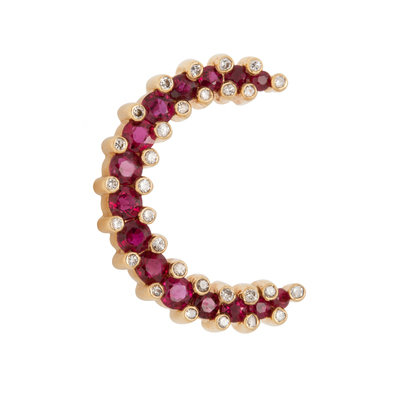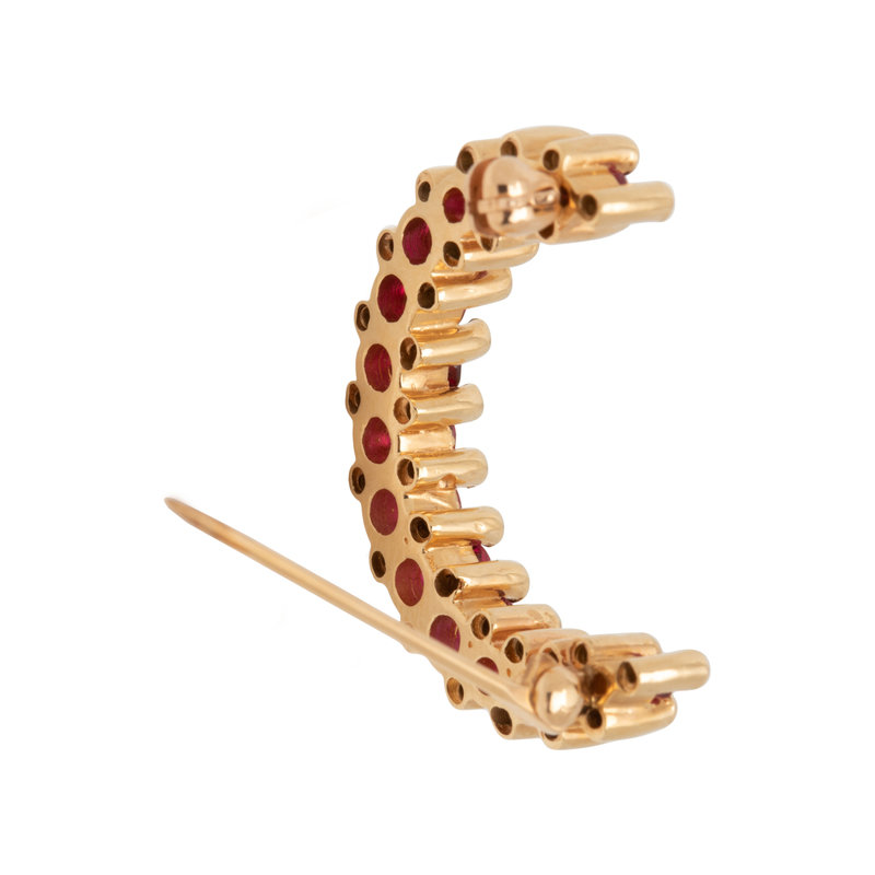 Containing 15 round mixed cut rubies and 32 round brilliant cut diamonds. Mounted in yellow gold. 1 x 5/8 inch.