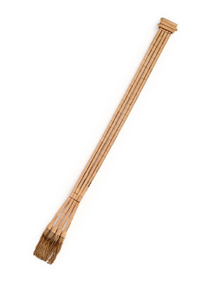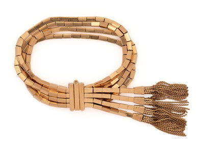 Consisting of four strands of rectangular gold beads, with clasp and serpentine chain tassels. 7 inches inner circumference.