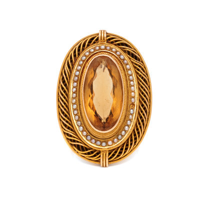 Containing one oval mixed cut citrine measuring approximately 19.05 x 9.85 mm, with seed pearl surround. Ring size 6 1/4.