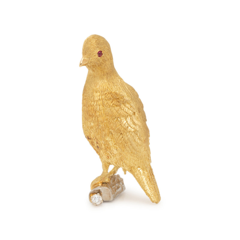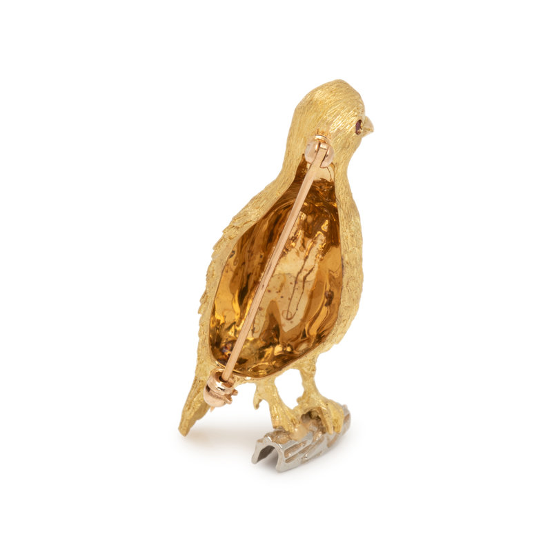 Designed as a bird perched on a branch containing one round brilliant cut diamond and two ruby eyes. 1 5/8 inches x 1 inch.