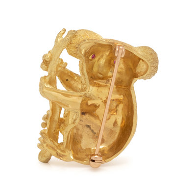 Consisting of a textured gold koala on a branch with two ruby eyes. 1 1/4 inches x 1 inch.