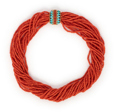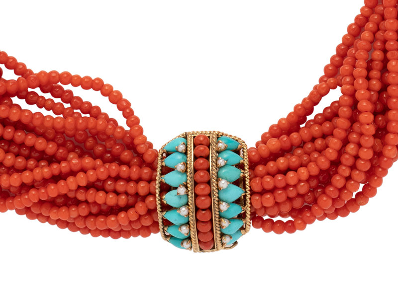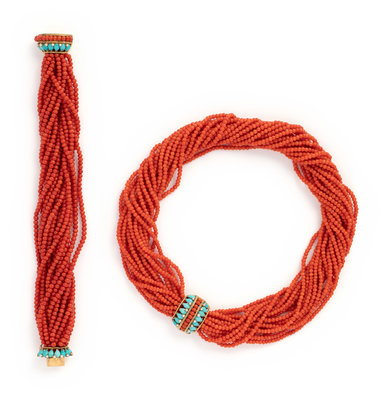 Consisting of a necklace with 18 strands of coral beads, strung knotted with a yellow gold clasp containing numerous coral beads, pear cabochon turquoise and seed pearls, together with a matching bracelet. Necklace: 18 3/4 inches long. Bracelet: 9 inches long.
