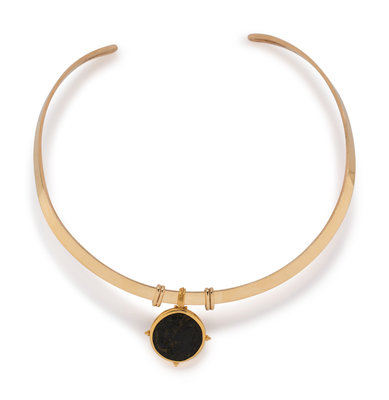 Consisting of a sculptural collar necklace suspending a high karat gold pendant containing one Roman coin. 14 3/4 inches inner circumference.