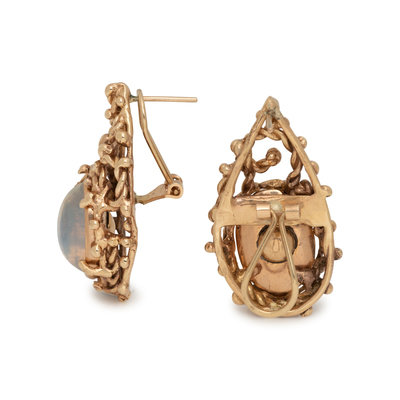 Containing two oval cabochon moonstones measuring approximately 14.00 x 10.50 mm, posts with clip backs. 1 1/4 inches long.