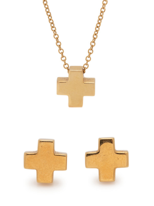 Consisting of a cross pendant suspended from a cable link chain necklace, together with a matching pair of stud earrings. Necklace; 16 inches long. Earrings: 1/4 inch long.