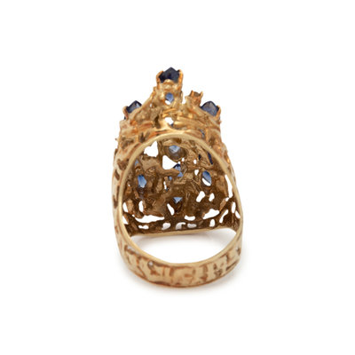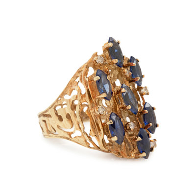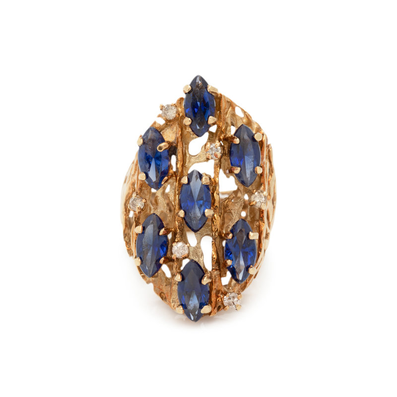 Containing seven marquise cut blue glass and six round brilliant cut diamonds. Ring size 7 1/2.