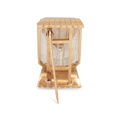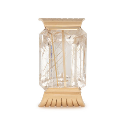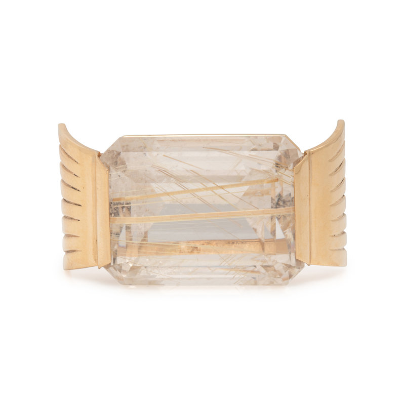 Containing one emerald cut rutilated quartz measuring approximately 24.50 x 18.35 x 4.45 mm. Mounted in yellow gold. 1 3/8 inches x 3/4 inch.