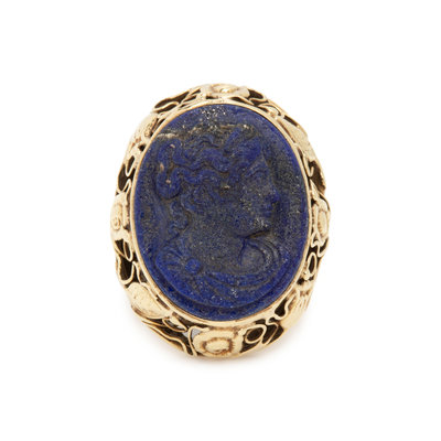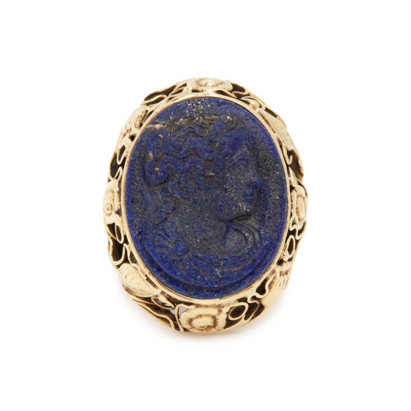 Containing one oval lapis lazuli cameo depicting the profile of a woman. Mounted in yellow gold. Ring size 7 1/4.