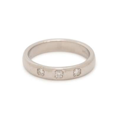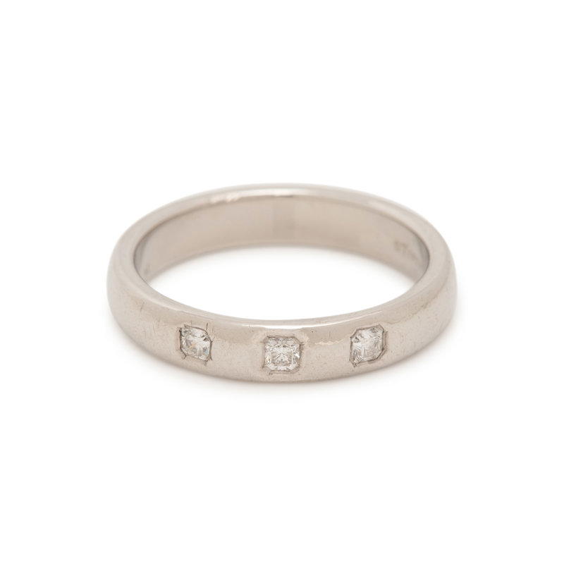 Containing three Lucida diamonds weighing approximately 0.15 carat total. Ring size 7.