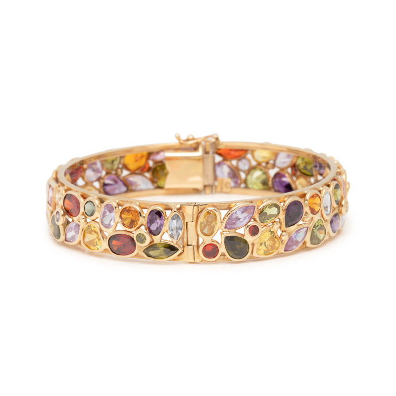 Containing numerous round, pear, oval and heart mixed cut gemstones of various colors, hinged with side clasp. 6 3/4 inches inner circumference.