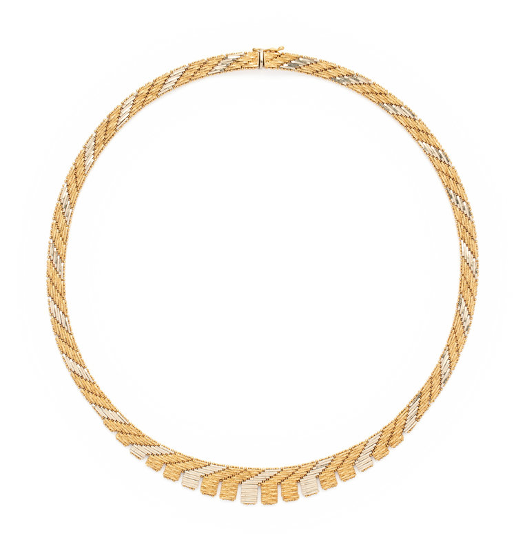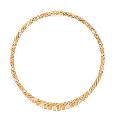 Consisting of textured yellow and high polish white gold links. 17 inches long.