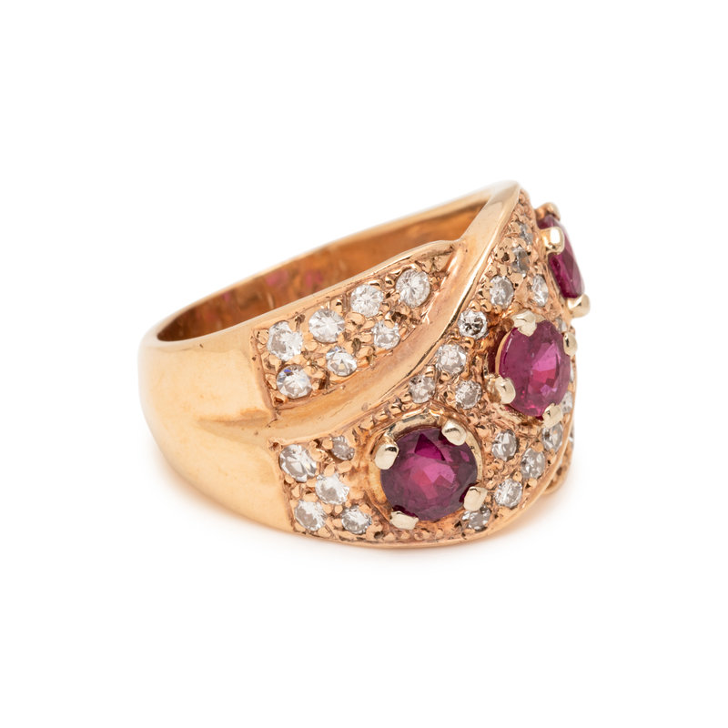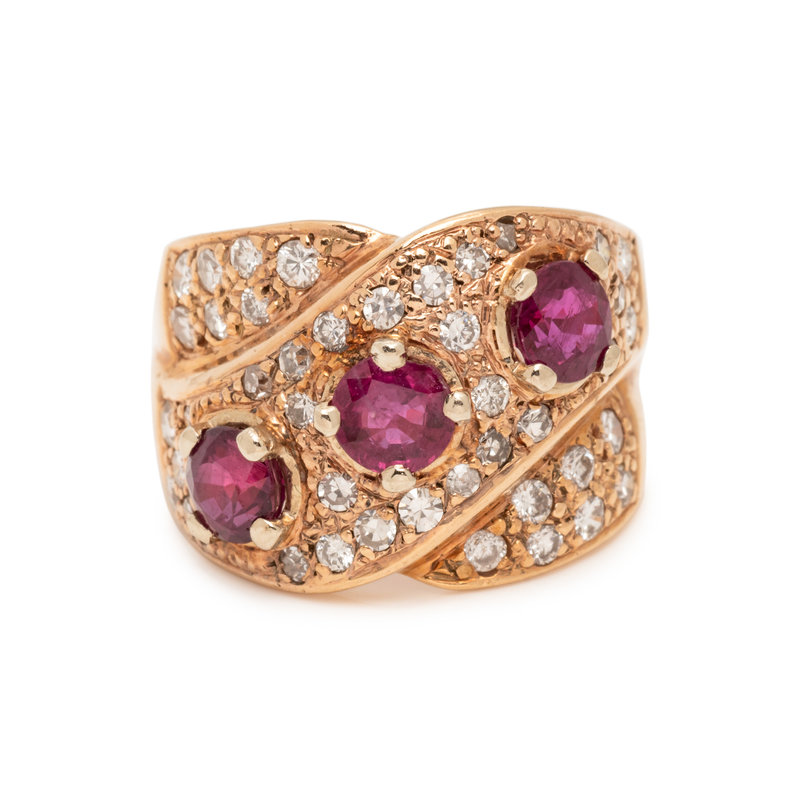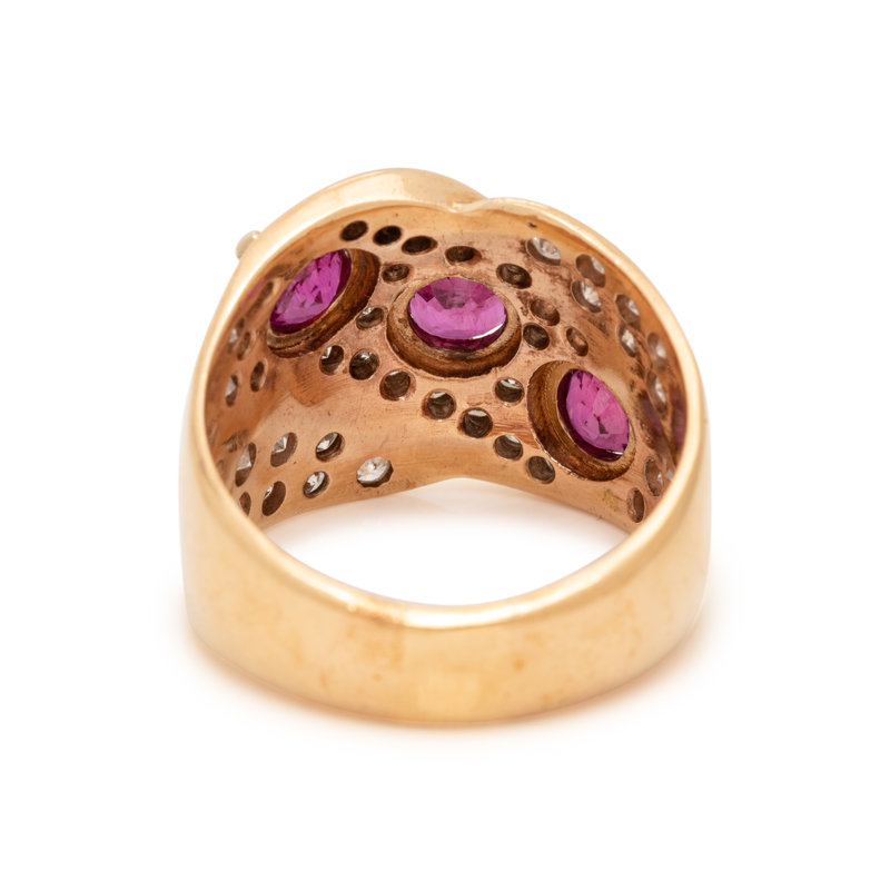 Containing three round mixed cut rubies measuring approximately 4.80 mm in diameter and 42 round brilliant and single cut diamonds weighing approximately 0.85 carat total. Mounted in yellow gold. Ring size 7 1/4.