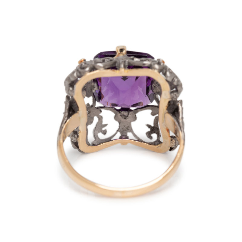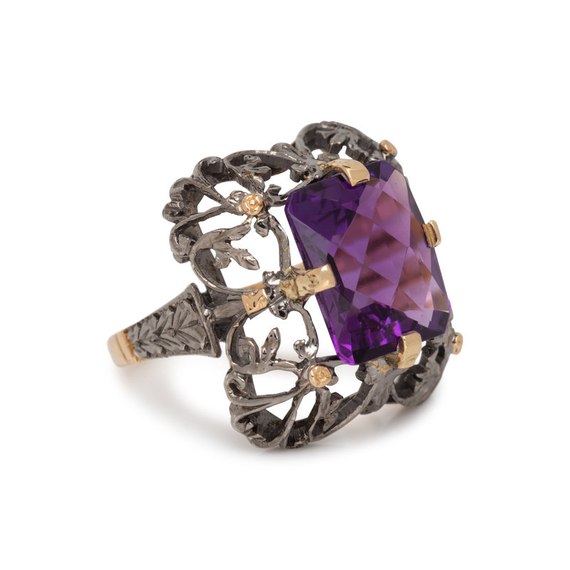 Containing one rectangular checkerboard amethyst measuring approximately 11.10 x 9.15 mm. Mounted in yellow and blackened gold. Ring size 5.