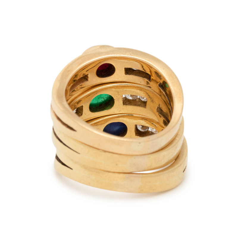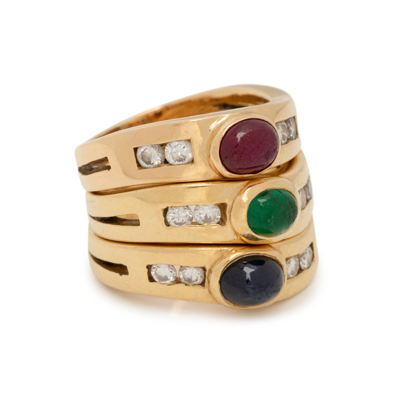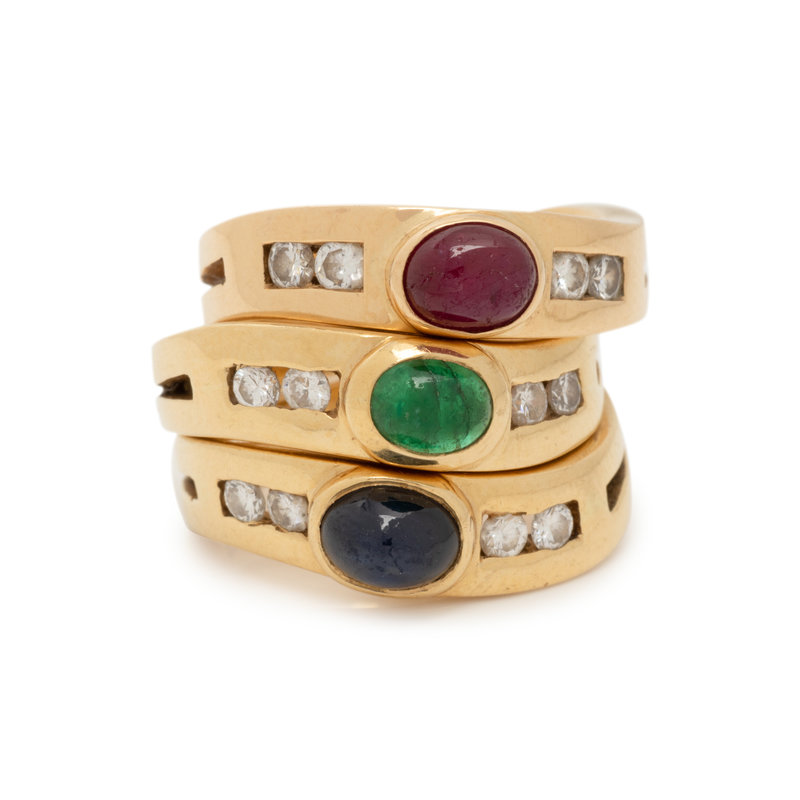 Consisting of three rings, each containing one round cabochon ruby, emerald and sapphire and four round brilliant cut diamonds weighing approximately 0.20 carat total. Ring size 5 1/4.