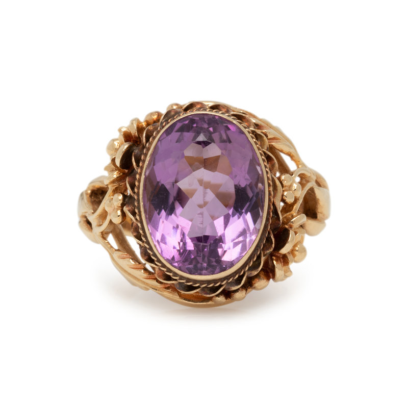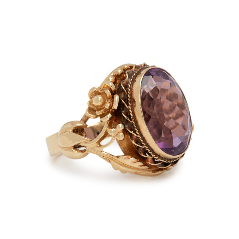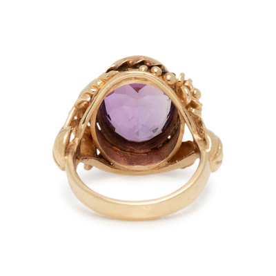 Containing one oval mixed cut amethyst measuring approximately 16.95 x 13.10 x 9.15 mm in a floral motif mounting. Ring size 9.