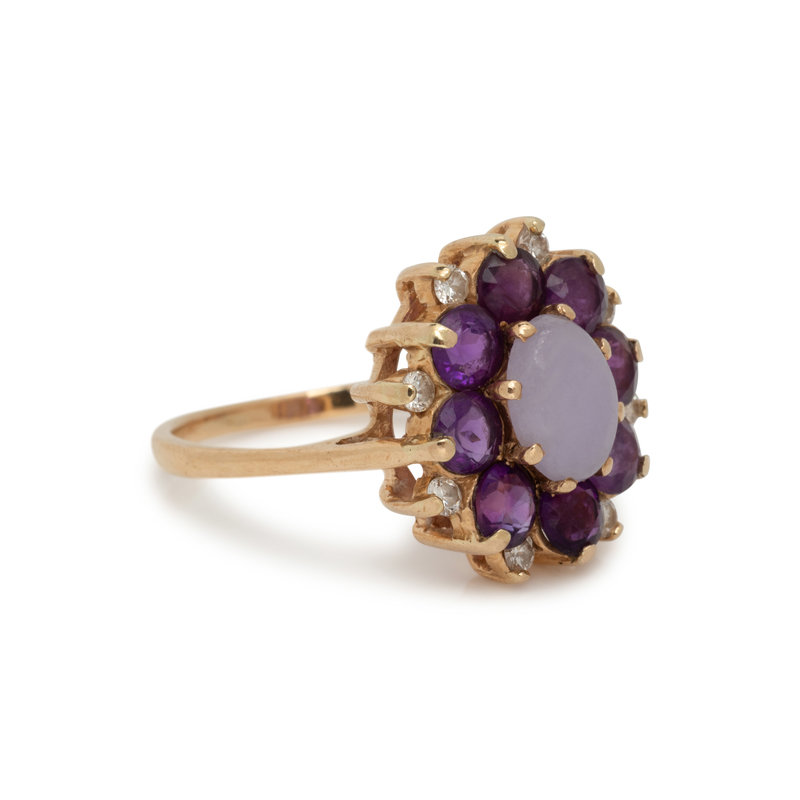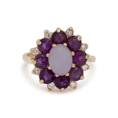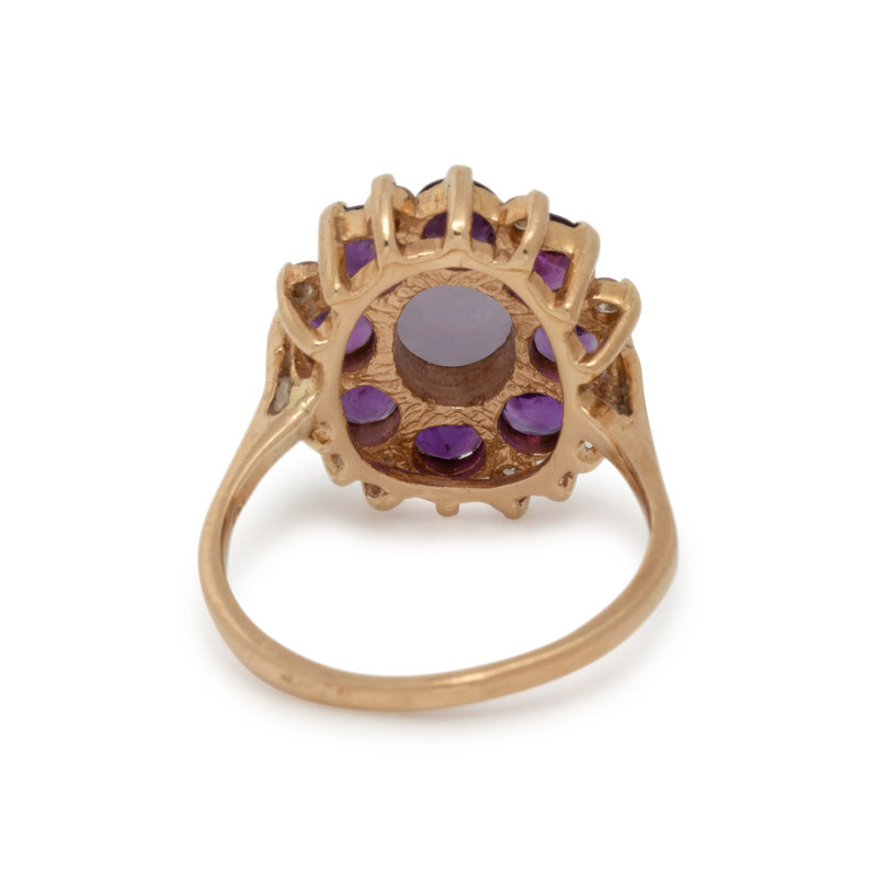 Containing one oval cabochon purple hardstone, eight round mixed cut amethyst and seven round brilliant cut diamonds. Mounted in yellow gold. Ring size 7.
