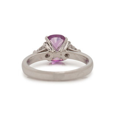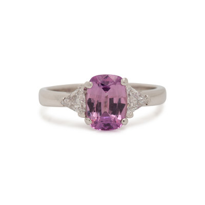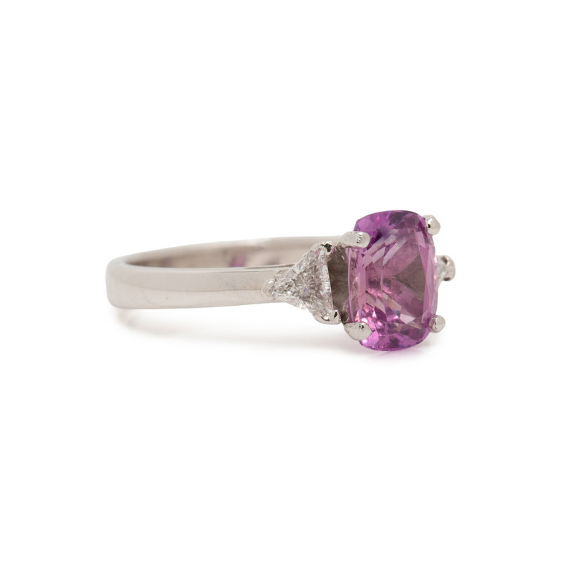 Containing one elongated cushion mixed cut pink sapphire measuring approximately 8.30 x 6.15 mm and two triangular diamonds weighing approximately 0.45 carat total. Mounted in platinum. Ring size 6.