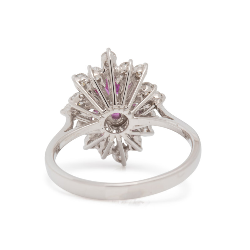 Containing one elongated cushion mixed cut pink sapphire measuring approximately 7.15 x 5.60 mm and 16 round brilliant cut diamonds weighing approximately 0.45 carat total. Mounted in white gold. Ring size 6 1/2.