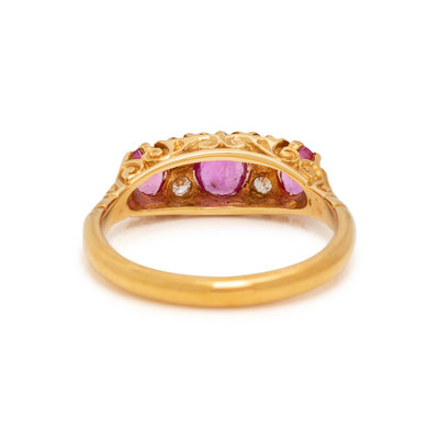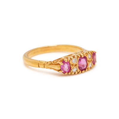 Containing three oval mixed cut pink sapphires and four round brilliant cut diamonds. Mounted in yellow gold. Ring size 6.