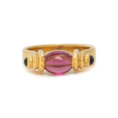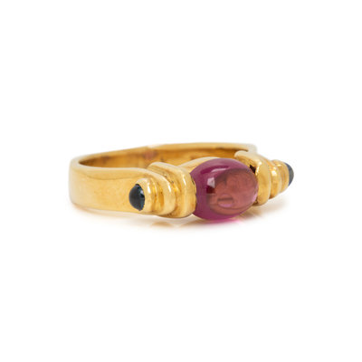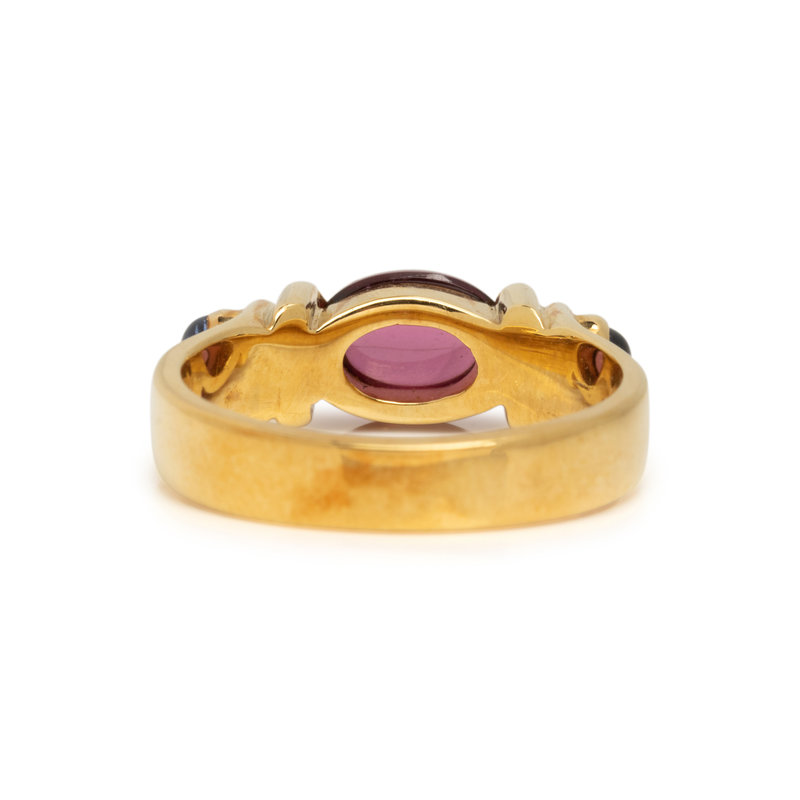 Containing one oval cabochon garnet bead and two round cabochon sapphires. Rings size 6 1/2.