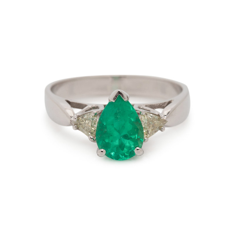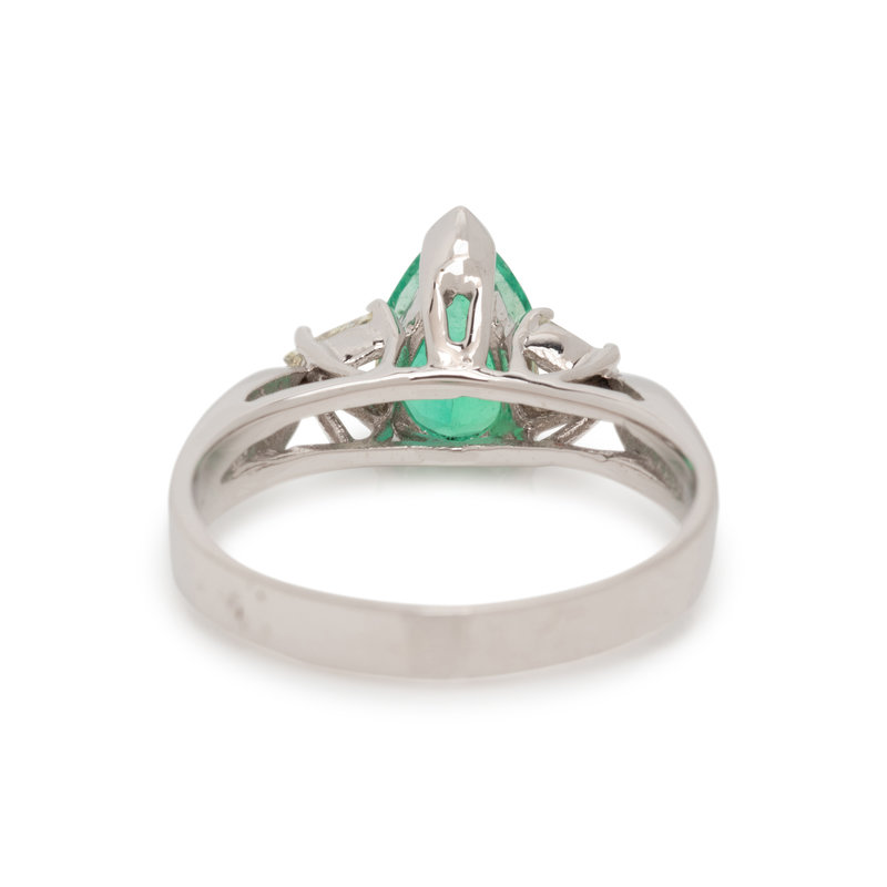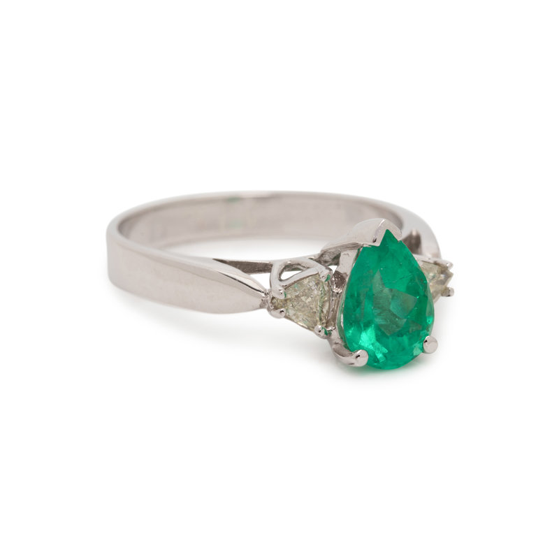 Containing one pear mixed cut emerald measuring approximately 7.85 x 5.90 x 4.50 mm and two triangular shaped diamonds weighing approximately 0.20 carat total. Mounted in white gold. Ring size 6 1/4.