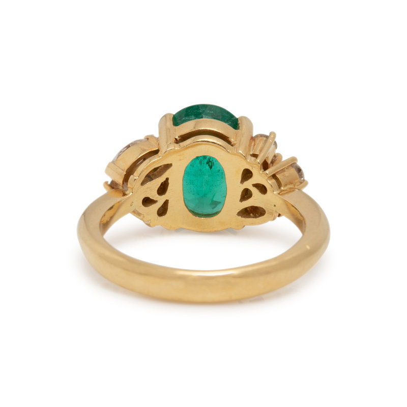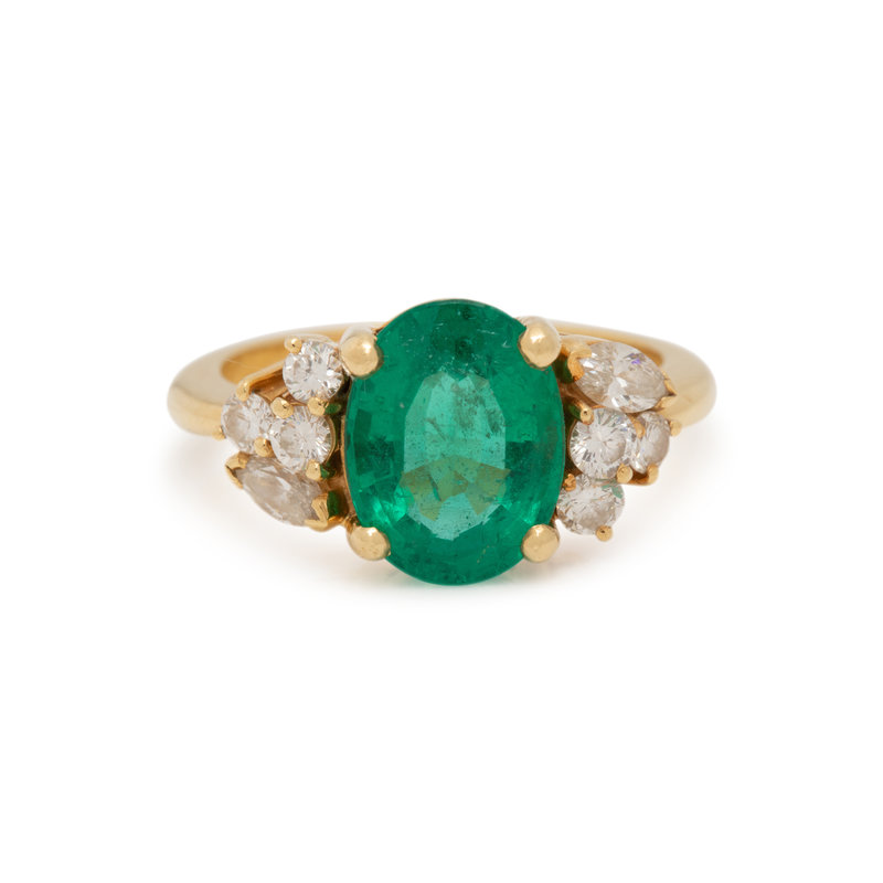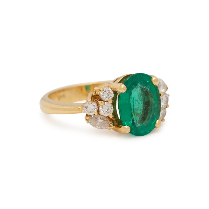 Containing one oval mixed cut emerald measuring approximately 10.95 x 8.30 x 5.15 mm, six round brilliant and two marquise cut diamonds weighing approximately 0.60 carat total. Mounted in yellow gold. Ring size 6 3/4.
