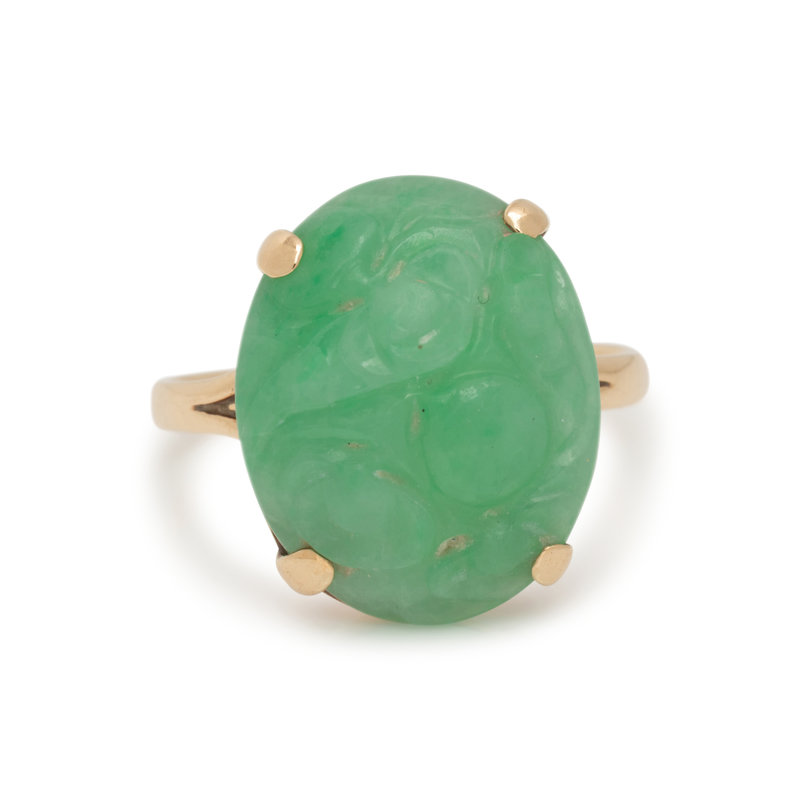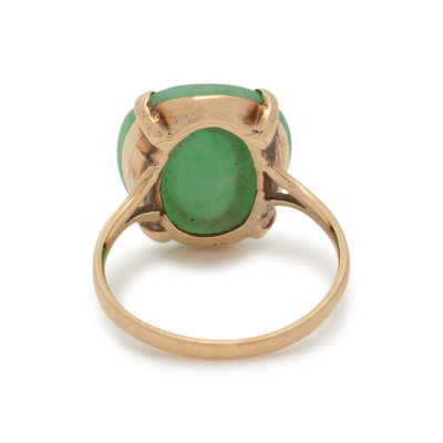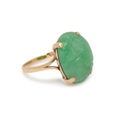 Containing one oval carved jade measuring approximately 17.50 x 14.05 mm. Mounted in rose gold. Ring size 7 1/2.