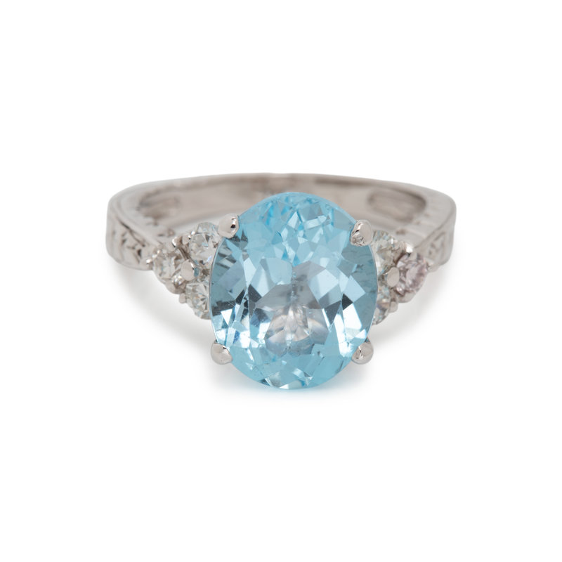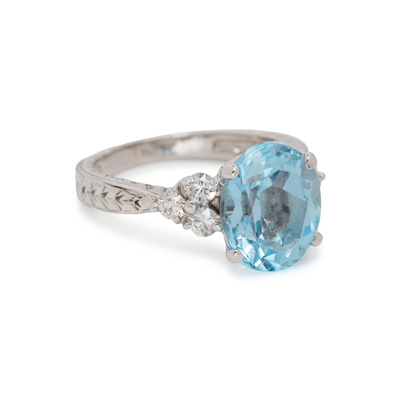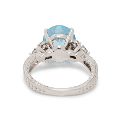 Containing one oval mixed cut blue topaz measuring approximately 11.85 x 9.90 mm and six round brilliant cut diamonds weighing approximately 0.40 carat total. Mounted in white gold. Ring size 7.