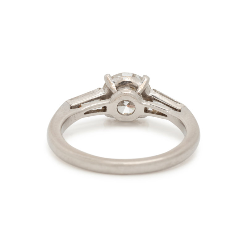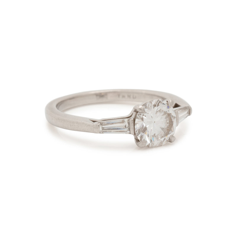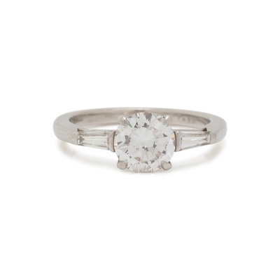 Containing one transitional cut diamond weighing approximately 1.10 carats and two tapered baguette cut diamonds. Mounted in platinum. Ring size 5 1/4.