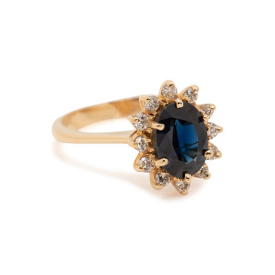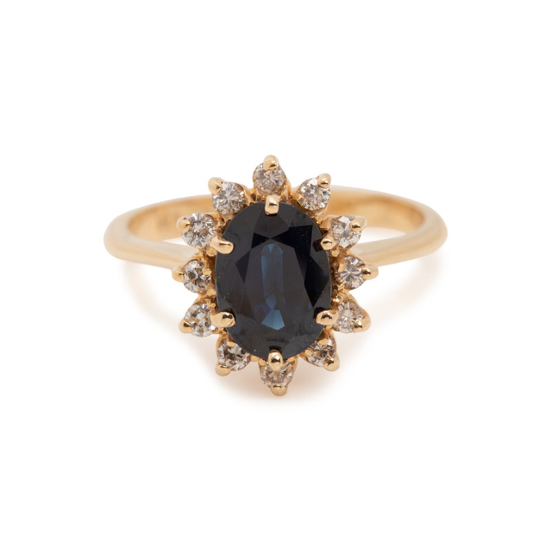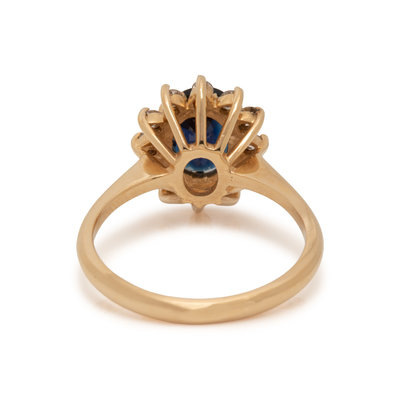 Containing one oval mixed cut sapphire measuring approximately 8.40 x 6.15 x 3.65 mm and 12 round brilliant cut diamonds. Mounted in yellow gold. Ring size 6.