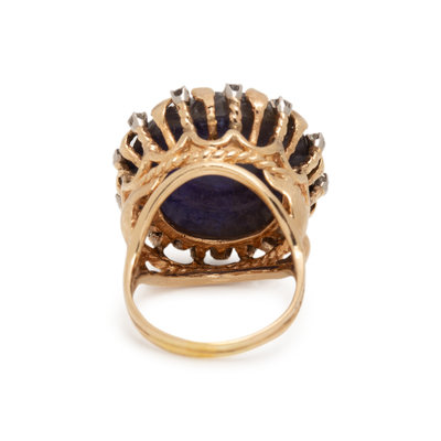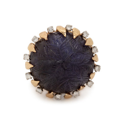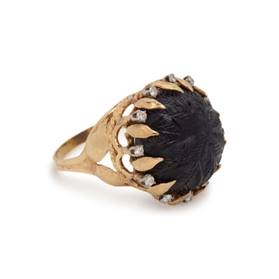 Containing one round carved cabochon sapphire measuring approximately 22.00 mm in diameter and 12 round brilliant cut diamonds weighing approximately 0.45 carat total. Mounted in yellow gold. Ring size 9 1/4.