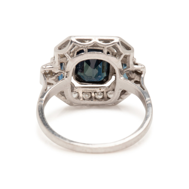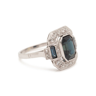 Containing one emerald cut sapphire measuring approximately 9.00 x 6.20 x 4.45 mm, two baguette cut sapphires and 22 single cut diamonds. Mounted in platinum. Ring size 5.