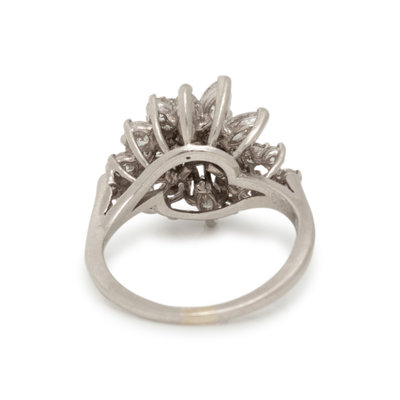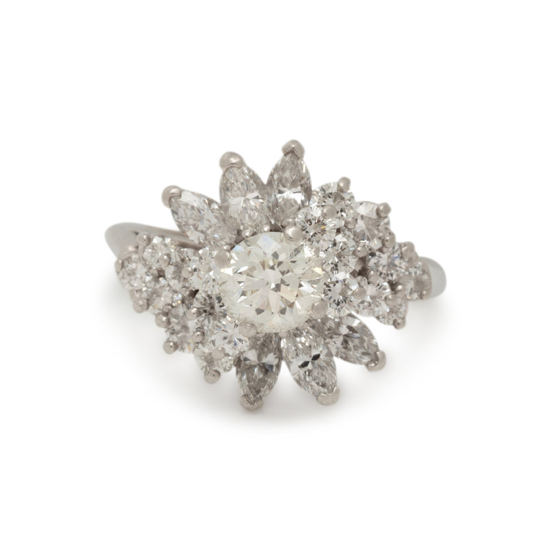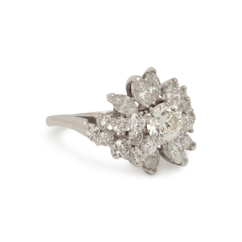 Containing one transitional cut diamond weighing approximately 0.74 carat, six marquise and 18 round brilliant cut diamonds weighing approximately 1.30 carats total. Mounted in platinum. Ring size 6 1/2.