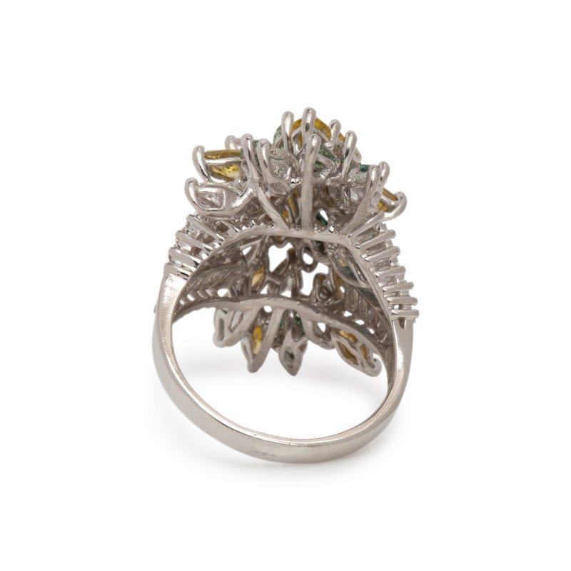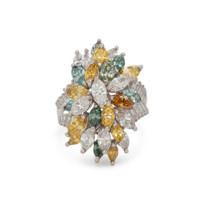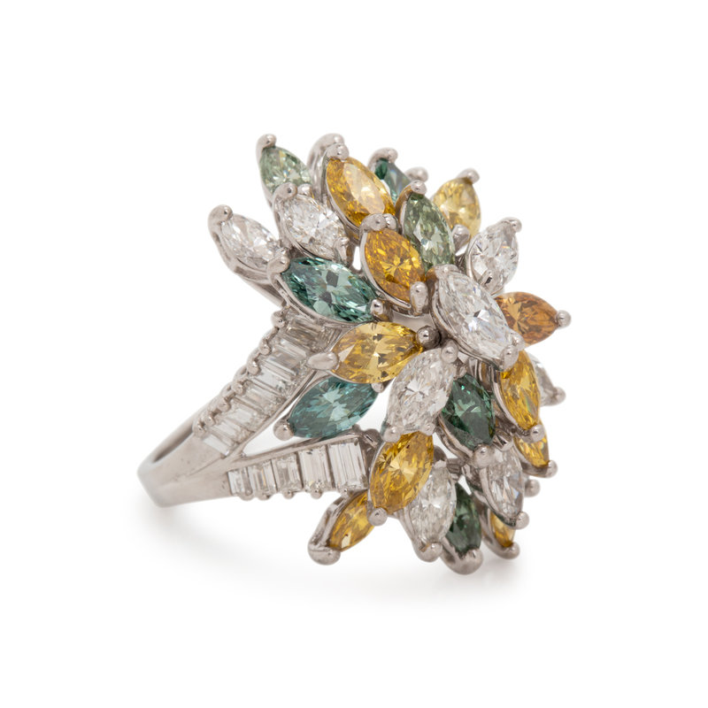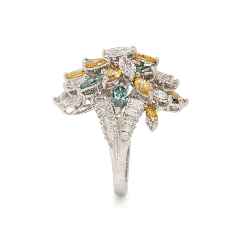 Containing 28 marquise cut diamonds and colored diamonds (origin of color not tested) weighing approximately 3.85 carats total and 24 baguette cut diamonds weighing approximately 1.05 carats total. Mounted in platinum. Ring size 7.