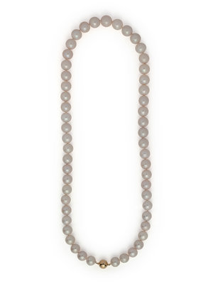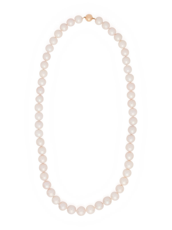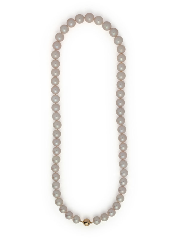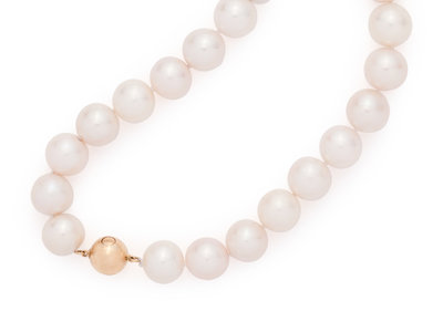Containing pearls measuring approximately 13.05-15.85 mm in diameter, strung knotted with a yellow gold clasp. 30 inches long.
