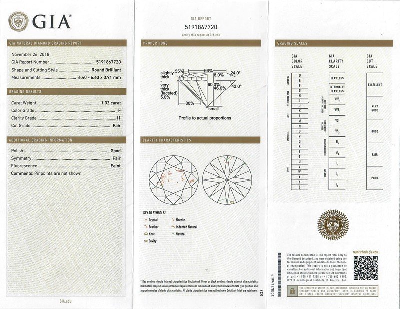 GIA, 2018, Report No. 5191867720, 1.02 carats, F color, I1 clarity, Faint fluorescence