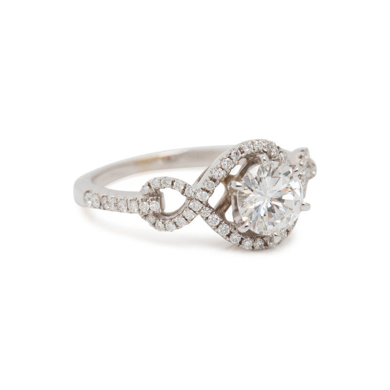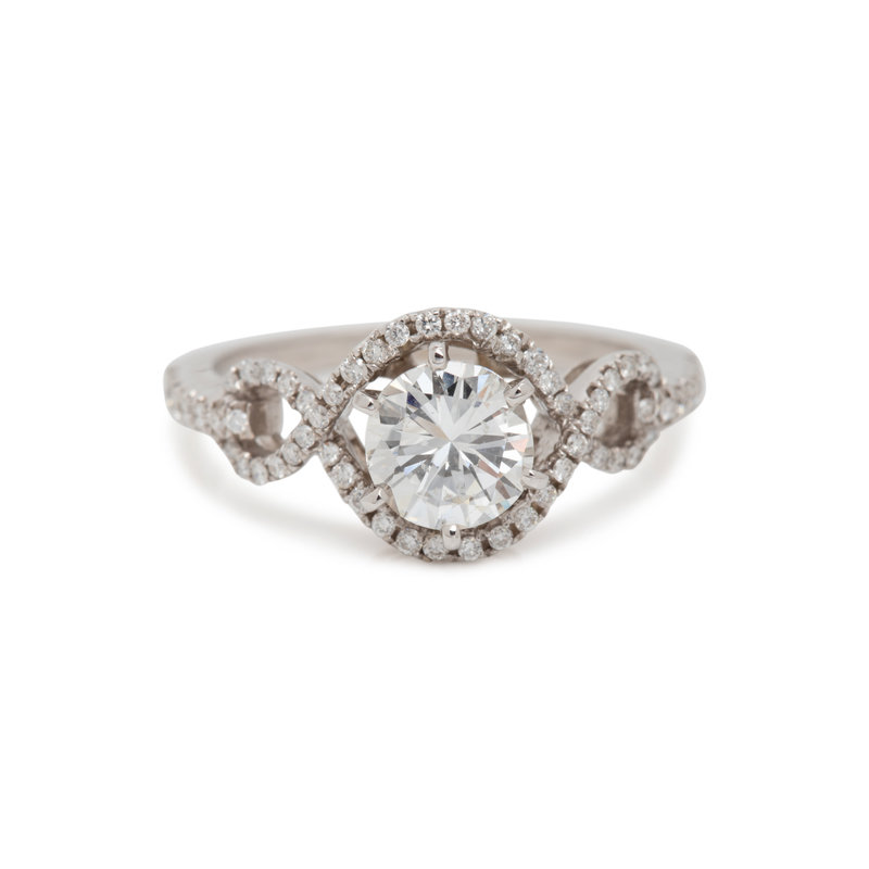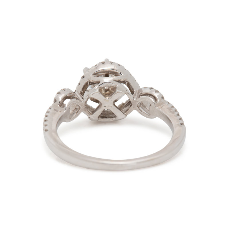 Containing one round brilliant cut diamond weighing 1.02 carats and 62 round brilliant cut diamonds weighing approximately 0.35 carat total. Mounted in white gold. Ring size 7.