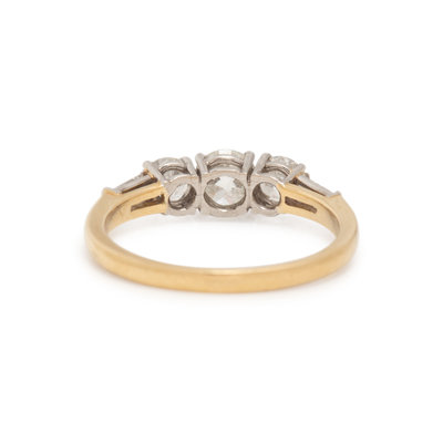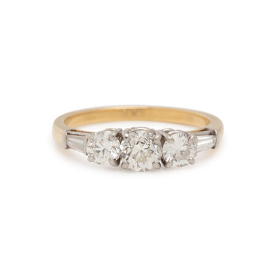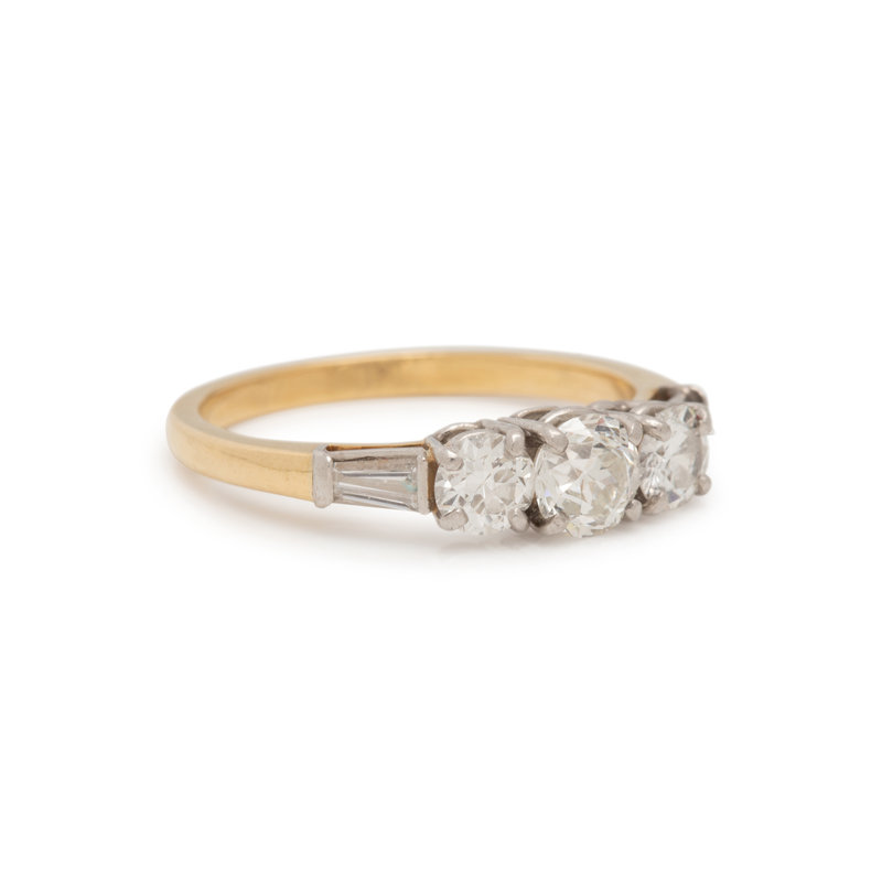 Containing three old European and transitional cut diamonds weighing approximately 0.75 carat total and two tapered baguette cut diamonds weighing approximately 0.20 carat total. Mounted in platinum and yellow gold. Ring size 5 3/4.