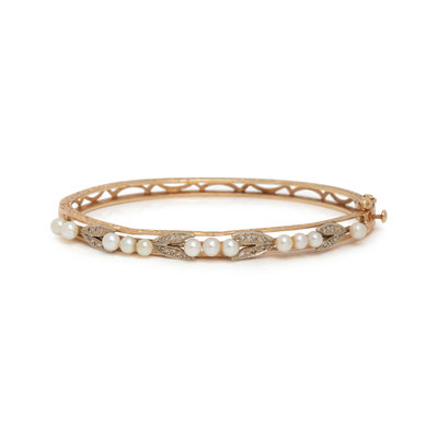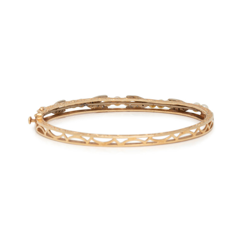 BICOLOR GOLD, CULTURED PEARL AND DIAMOND BANGLE BRACELET