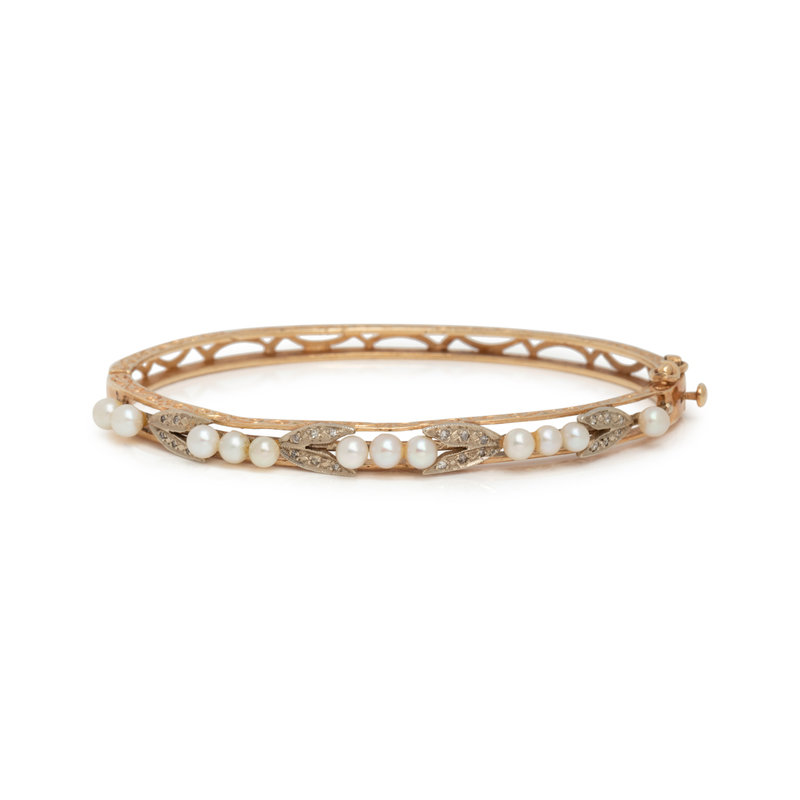 Containing 12 pearls measuring approximately 3.50-3.60 mm in diameter and 23 single cut diamonds, hinged with side clasp. 6 1/2 inches inner circumference.
