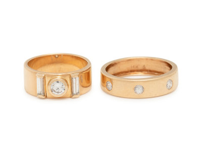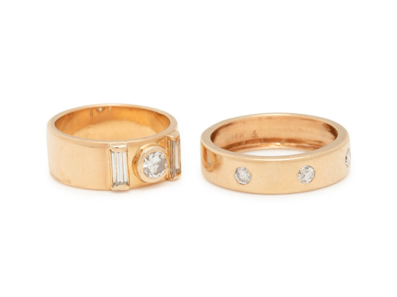 Consisting of a ring containing three round brilliant cut diamonds, together with a ring containing one round brilliant and two baguette cut diamonds. Ring sizes 6 1/4 and 4 1/4.